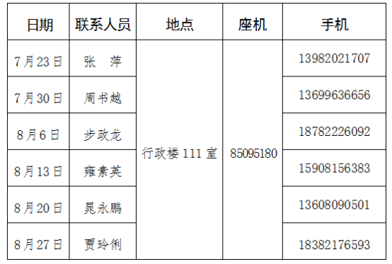 暑假期间,教务处/实验管理处于固定时间(上午8:30至下午4:30)集中办理或用印。值班安排如下: